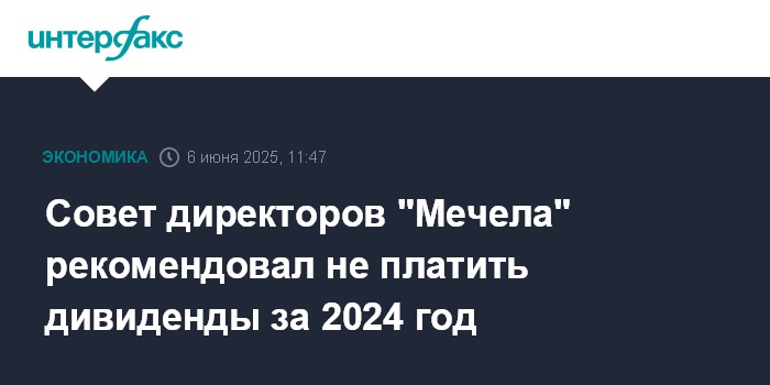 Москва. 6 июня. INTERFAX.RU - Совет директоров "Мечела" рекомендовал не выплачивать дивиденды на все виды акций в связи с получением убытка за 2024 год, сообщила компания.