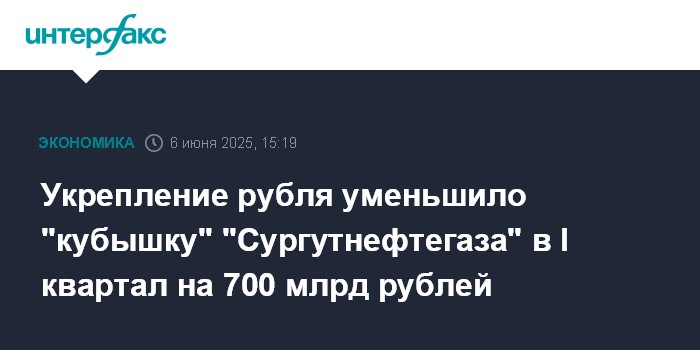 Москва. 6 июня. INTERFAX.RU - Ликвидные активы (или так называемая "кубышка") "Сургутнефтегаза" по итогам первого квартала 2025 года снизились примерно на 700 млрд рублей, до 5,7 трлн рублей, свидетельствуют расчеты "Интерфакса".