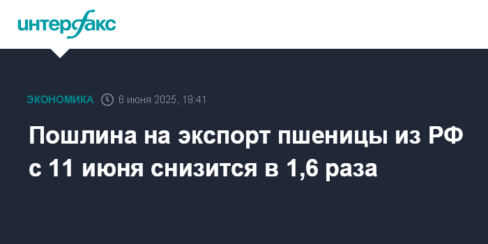 Москва. 6 июня. INTERFAX.RU - Ставка пошлины на экспорт пшеницы из РФ с 11 июня составит 652,5 рубля против 1 023,5 рубля за тонну неделей ранее, сообщает Минсельхоз.
