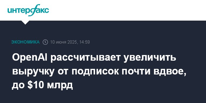 Москва. 10 июня. INTERFAX.RU - Годовая регулярная выручка (annual recurring revenue, ARR) американской OpenAI выросла до $10 млрд с $5,5 млрд на конец прошлого года, передает CNBC со ссылкой на представителя ИИ-компании.