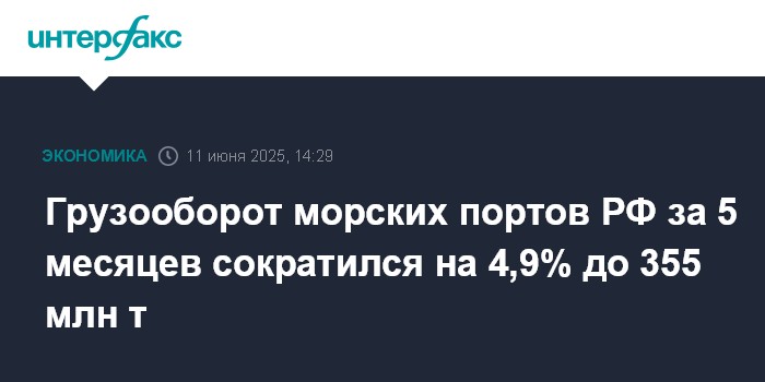 Москва. 11 июня. INTERFAX.RU - Грузооборот морских портов РФ в январе-мае 2025 года уменьшился на 4,9% по сравнению с аналогичным периодом 2024 года и составил 355,3 млн тонн. Об этом сообщается на сайте Ассоциации морских торговых портов (АСОП).