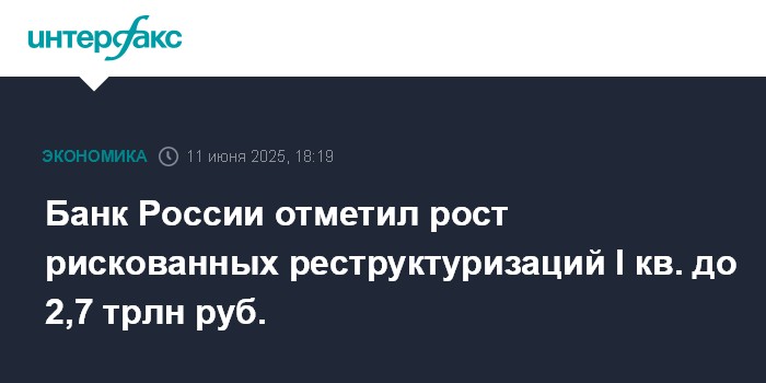 Москва. 11 июня. INTERFAX.RU - Рискованные реструктуризации в первом квартале 2025 года выросли на 0,3 трлн руб., до 2,7 трлн руб., говорится в обзоре банковского сектора ЦБ.