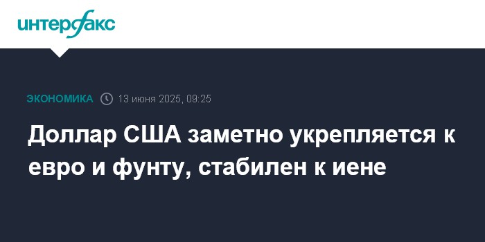 Москва. 13 июня. INTERFAX.RU - Курс доллара США заметно повышается в парах с евро и фунтом стерлингов, но стабилен к иене утром в пятницу.