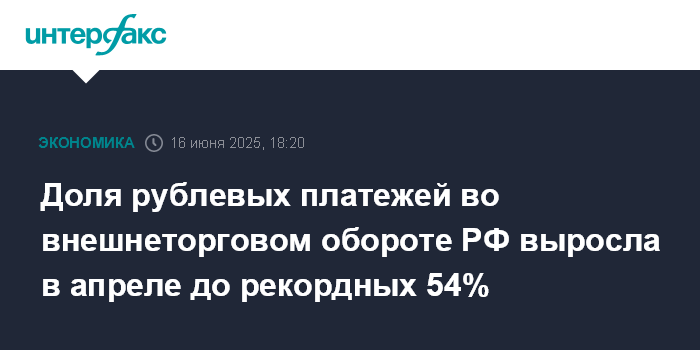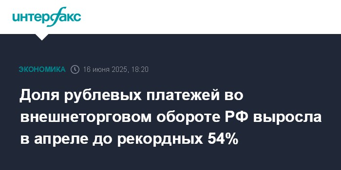 Суммарно доля платежей в российских рублях во внешнеторговых расчетах РФ в апреле выросла до рекордных 54,0%, превысив прежний максимум, зафиксированный в марте (51,5%), когда впервые более половины расчетов во внешней торговле РФ были выполнены в национальной российской валюте.