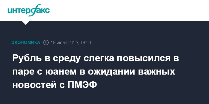 Москва. 18 июня. INTERFAX.RU - Китайский юань слегка опустился на Московской бирже по итогам торгов в среду. Рубль при этом сумел сохранить небольшой плюс, несмотря на начавшееся вечером падение цен на нефть. В целом участники рынка не проявляли особой активности в ходе торговой сессии, так как находились в ожидании важных новостей с Петербургского международного экономического форума (ПМЭФ-2025).