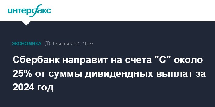 Москва. 19 июня. INTERFAX.RU - Сбербанк направит на специальные счета типа "С" около 25% от суммы дивидендных выплат за 2024 год, заявил зампред правления банка Тарас Скворцов.