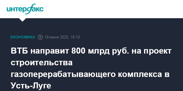 Москва. 19 июня. INTERFAX.RU - ВТБ в течение нескольких лет направит 800 млрд рублей на финансирование проекта строительства комплекса переработки этансодержащего газа в Усть-Луге (Ленинградская область), сообщил журналистам глава банка Андрей Костин.