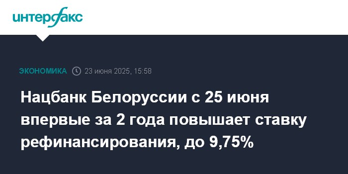 Нацбанк Белоруссии с 25 июня впервые за 2 года повышает ставку рефинансирования, до 9,75%