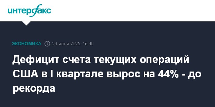 Москва. 24 июня. INTERFAX.RU - Отрицательное сальдо счета текущих операций платежного баланса США в первом квартале 2025 года увеличилось на 44,3% и достигло исторического максимума в $450,2 млрд, говорится в отчете министерства торговли страны.
