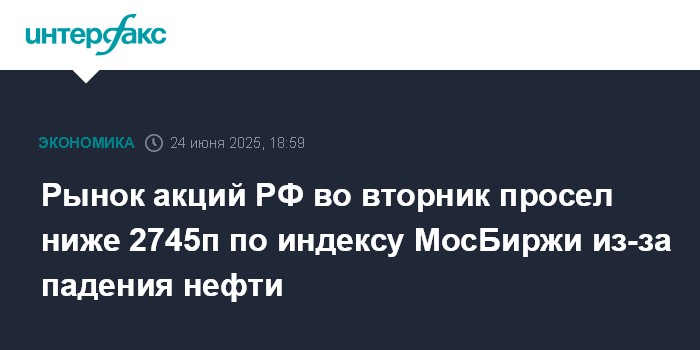 Москва. 24 июня. INTERFAX.RU - Рынок акций РФ во вторник снизился на фоне упавшей нефти (фьючерс на Brent откатился к $67,5 за баррель) из-за наметившегося ослабления напряженности на Ближнем Востоке, в то время как внешние фондовые площадки подавали позитивные сигналы. Индекс МосБиржи завершил основные торги ниже 2745 пунктов, отыграв часть дневных потерь; лидировали в откате акции "Роснефти" (-4,7%) и "префы" "Транснефти" (-2,5%); выросли бумаги "МТС" (+2,9%) на новостях об утверждении акционерами дивидендов за 2024 год.