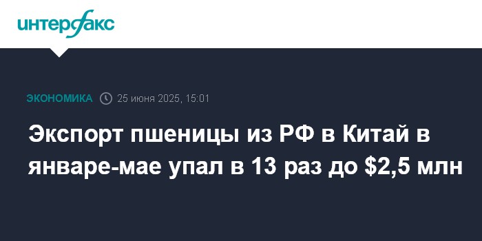 Как сообщалось, в 2024 году Китай импортировал российской пшеницы на $87,252 млн, что в 2,5 раза больше, чем в 2023 году (на $34,71 млн).