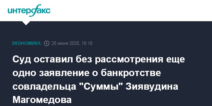 Москва. 25 июня. INTERFAX.RU - Арбитражный суд Москвы 18 июня оставил без рассмотрения заявление ООО "ГК "Инфраструктура" о банкротстве совладельца группы "Сумма" Зиявудина Магомедова.