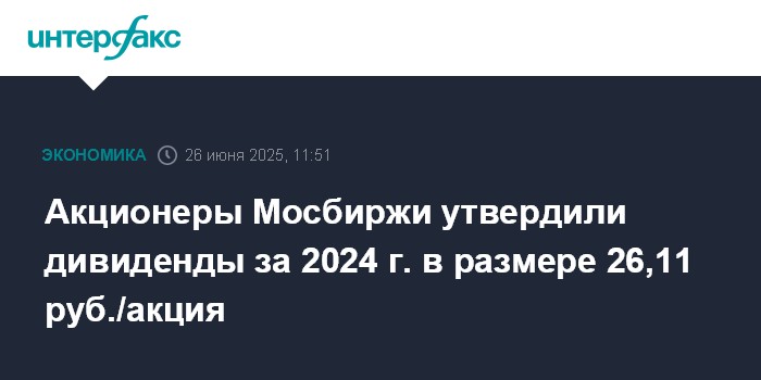 Москва. 26 июня. INTERFAX.RU - Акционеры "Московской биржи" утвердили дивиденды по итогам 2024 года в размере 26,11 рубля на акцию, передал корреспондент "Интерфакса", присутствующий на собрании.