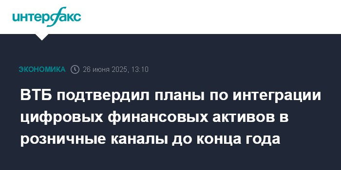 Москва. 26 июня. INTERFAX.RU - ВТБ по-прежнему планирует до конца 2025 года интегрировать цифровые финансовые активы (ЦФА) в интерфейсы для розничных инвесторов, сообщил руководитель дирекции ЦФА банка Сергей Рябов.