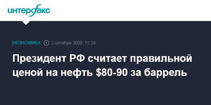 Малоархангельск (Орловская область). 2 октября. INTERFAX.RU - Президент РФ Дмитрий Медведев считает, что правильная цена на нефть сейчас должна составлять $80-$90 за баррель.