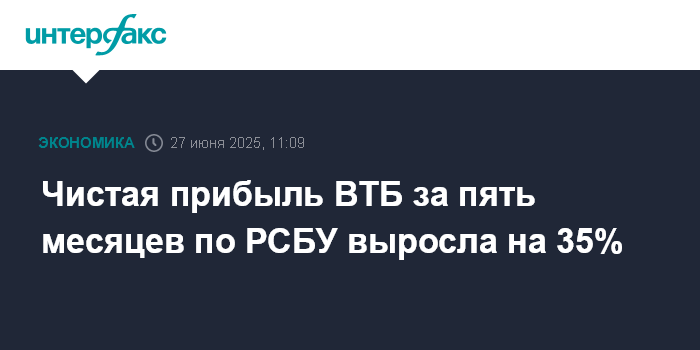 Москва. 27 июня. INTERFAX.RU - Чистая прибыль ВТБ за 5 месяцев 2025 года по РСБУ составила 79,78 млрд руб. против 59,32 млрд руб. за аналогичный период прошлого года (рост на 35%).