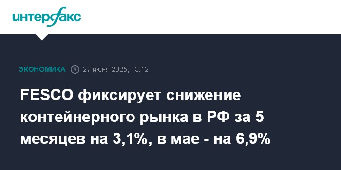 Москва. 27 июня. INTERFAX.RU - Российский контейнерный рынок в январе-мае 2025 года сократился на 3,1% относительно аналогичного периода 2024 года до 2,671 млн TEU, подсчитали аналитики транспортной группы FESCO (головная компания - ПАО "Дальневосточное морское пароходство", ДВМП).