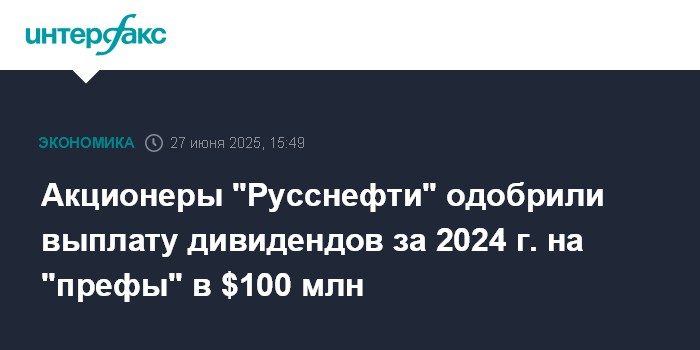 Москва. 27 июня. INTERFAX.RU - Акционеры ПАО "Русснефть" на годовом собрании в пятницу утвердили выплату дивидендов на привилегированные акции за 2024 год в размере $1,02 на каждую акцию такого типа, сообщил журналистам представитель одного из акционеров компании, принимавший участие в собрании.