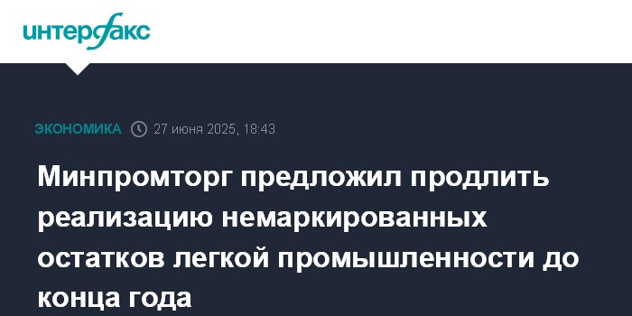 Москва. 27 июня. INTERFAX.RU - Минпромторг РФ предложил продлить реализацию немаркированных остатков легкой промышленности до конца 2025 года, говорится в сообщении министерства.
