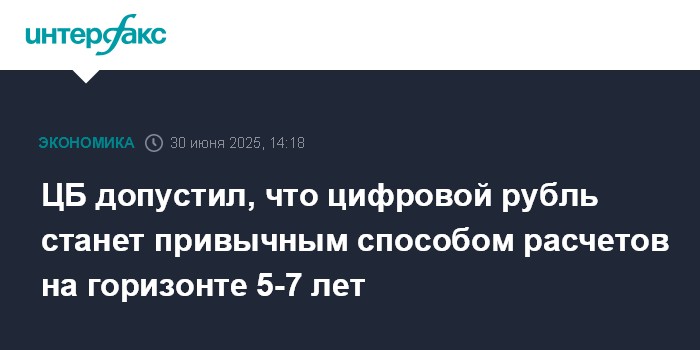 Москва. 30 июня. INTERFAX.RU - Банк России рассчитывает, что цифровой рубль станет привычным способом расчетов на горизонте 5-7 лет. Об этом говорится в отчете ЦБ "Цифровой рубль: текущий статус проекта".