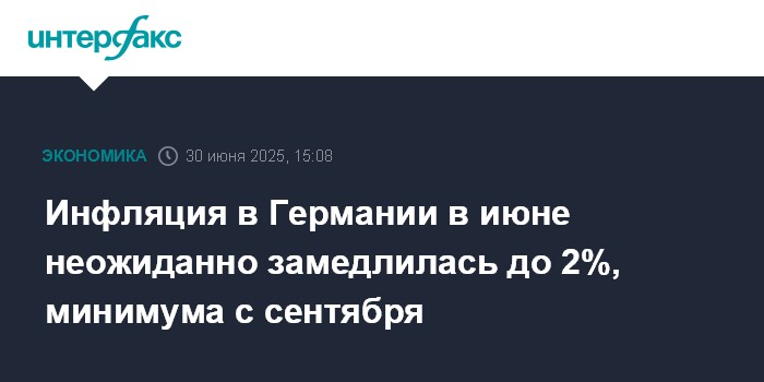 Москва. 30 июня. INTERFAX.RU - Потребительские цены в Германии, гармонизированные со стандартами Евросоюза, в июне увеличились на 2% в годовом выражении, говорится в сообщении Федерального статистического управления страны (Destatis), представившего предварительные данные.