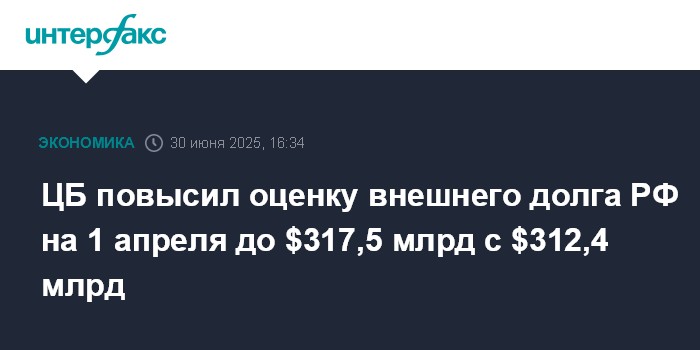 Москва. 30 июня. INTERFAX.RU - Оценка совокупного внешнего долга РФ по состоянию на 1 апреля 2025 года повышена до $317,5 млрд (14,5% ВВП за последние 12 месяцев), предварительно он оценивался в $312,4 млрд. Это следует из данных, опубликованных на сайте ЦБ РФ.
