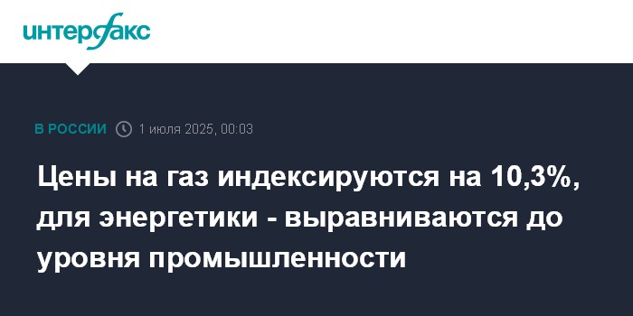 Москва. 1 июля. INTERFAX.RU - Оптовые цены на газ ПАО "Газпром" (регулируемые цены) с 1 июля 2025 года повышаются на 10,3% для всех категорий потребителей (как населения, так и промышленности).