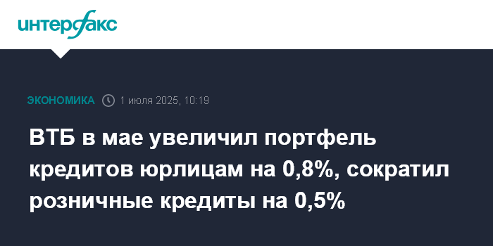 ВТБ в мае увеличил портфель кредитов юрлицам на 0,8%, сократил розничные кредиты на 0,5%