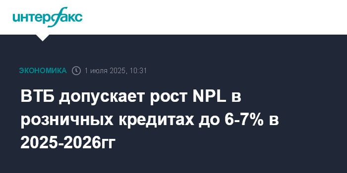 Москва. 1 июля. INTERFAX.RU - Доля просроченной задолженности (NPL, свыше 90 дней) в розничном кредитном портфеле ВТБ в 2025-2026 годах может вырасти до 6-7%, но это далеко от пиковых значений, сказал журналистам первый зампред правления банка Дмитрий Пьянов.