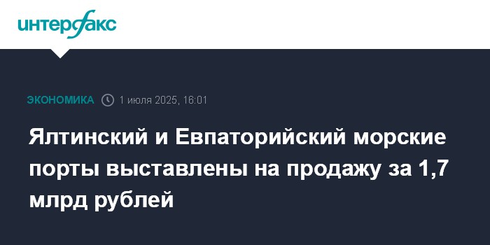 Москва. 1 июля. INTERFAX.RU - Минимущества Крыма выставило на продажу 100% акций Ялтинского и Евпаторийского морских портов, сообщает сайт площадки ГИС "Торги".
