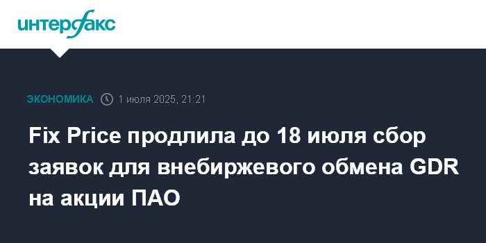Москва. 1 июля. INTERFAX.RU - Fix Price решила продлить срок приема оферт для внебиржевого обмена GDR на акции российского ПАО "Фикс Прайс" до 18 июля, сообщила компания.
