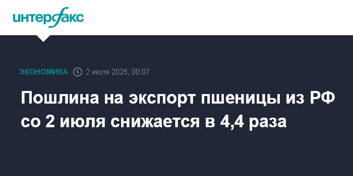 Москва. 2 июля. INTERFAX.RU - Ставка пошлины на экспорт пшеницы из РФ со 2 июля составляет 56,3 рубля против 248,3 рубля за тонну неделей ранее, сообщает Минсельхоз.
