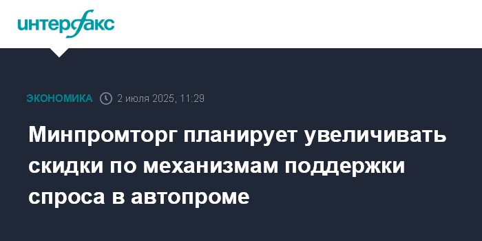 Москва. 2 июля. INTERFAX.RU - Минпромторг РФ планирует увеличивать скидки по механизмам поддержки спроса в автопроме, а также полноценно восстанавливать программы "Первый автомобиль" и "Семейный автомобиль". Об этом сообщил глава ведомства Антон Алиханов в ходе правительственного часа в Совете Федерации.