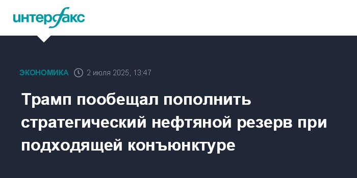 Москва. 2 июля. INTERFAX.RU - Президент США Дональд Трамп пообещал пополнить стратегический нефтяной резерв (SPR) страны при подходящей рыночной конъюнктуре, передает Reuters.