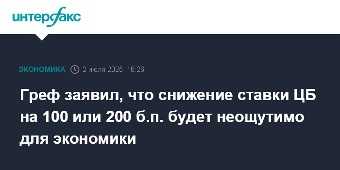 Москва. 2 июля. INTERFAX.RU - Снижение ключевой ставки ЦБ РФ на 100 или 200 базисных пунктов (б.п.) несущественно для экономики, нужен более серьезный шаг, считает президент - председатель правления Сбербанка Герман Греф.