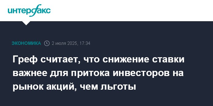 Москва. 2 июля. INTERFAX.RU - Интерес инвесторов к вложениям в российский рынок акционерного капитала вернет только снижение ключевой ставки ЦБ, роль льгот несущественна, считает глава Сбербанка Герман Греф.