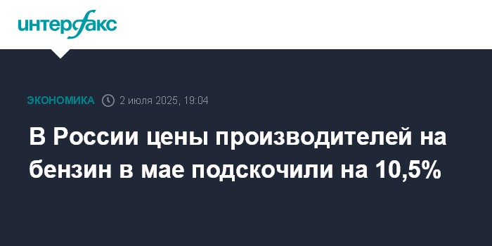 Москва. 2 июля. INTERFAX.RU - В России в мае цены производителей на бензин ускорили рост до 10,5% относительно предыдущего месяца после повышения на 2,2% в апреле и снижения в предыдущие шесть месяцев, сообщил Росстат.