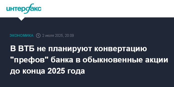 В ВТБ не планируют конвертацию "префов" банка в обыкновенные акции до конца 2025 года