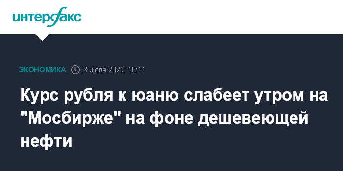 Москва. 3 июля. INTERFAX.RU - На "Московской бирже" утром в четверг рубль дешевеет к юаню на фоне дешевеющей нефти. Участники рынка находятся в ожидании новых заявлений представителей монетарных властей с Финансового конгресса Банка России, который проходит в Петербурге 2-4 июля.
