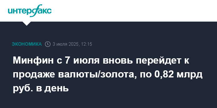 Минфин с 7 июля вновь перейдет к продаже валюты/золота, по 0,82 млрд руб. в день