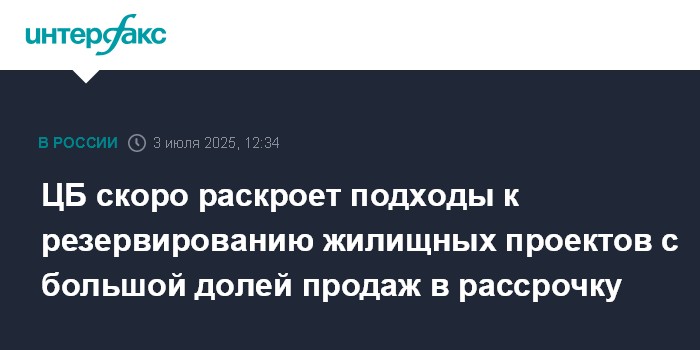 Москва. 3 июля. INTERFAX.RU - Банк России в ближайшее время представит подходы к резервированию жилищных проектов застройщиков с большой долей продаж в рассрочку, заявил журналистам директор департамента банковского регулирования и аналитики ЦБ Александр Данилов в кулуарах Финансового конгресса.