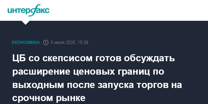 Москва. 3 июля. INTERFAX.RU - Банк России вернется к обсуждению расширения диапазона ценовых границ на торгах выходного дня после их запуска на срочном рынке, но по-прежнему настроен скептично к этой идее, заявил зампред ЦБ Филипп Габуния.