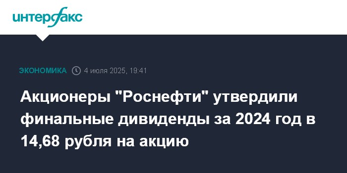 Москва. 4 июля. INTERFAX.RU - Акционеры "Роснефти" на годовом собрании утвердили финальные дивиденды за 2024 год в размере 14,68 рубля на акцию, сообщила компания.