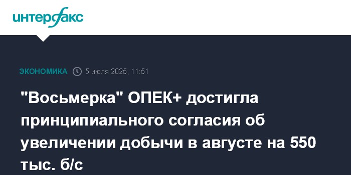 Москва. 5 июля. INTERFAX.RU - Восемь стран ОПЕК+, которые ранее приняли обязательства о добровольных сокращениях добычи, достигли принципиального согласия об ее увеличении в августе на 550 тыс. баррелей в сутки (б/с), сообщает агентство Bloomberg со ссылкой на источники в делегациях стран.