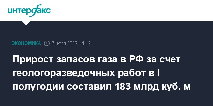 Москва. 7 июля. INTERFAX.RU - Суммарный прирост запасов России за счет геологоразведочных работ в первом полугодии 2025 года по газу составил 183 млрд кубометров, нефти - 54,5 млн тонн, конденсата - 15 млн тонн, сообщили "Интерфаксу" в Роснедрах.