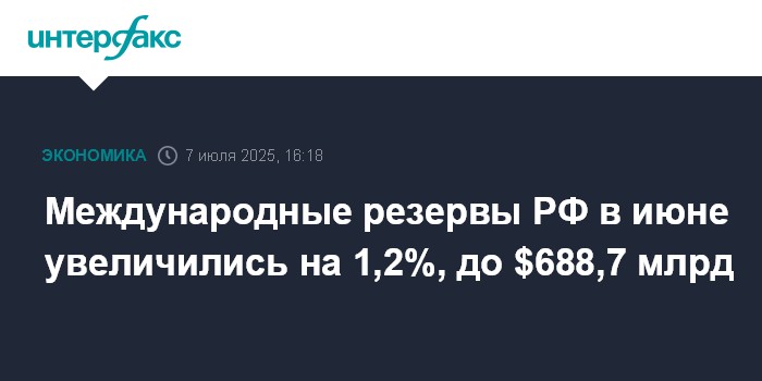 Москва. 7 июля. INTERFAX.RU - Объем международных (золотовалютных) резервов РФ в июне 2025 года увеличился на $8,352 млрд, или на 1,2%, до $688,731 млрд с $680,379 млрд, согласно информации на сайте ЦБ РФ.