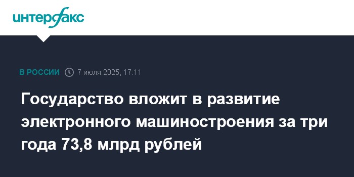 Москва. 7 июля. INTERFAX.RU - Государство может инвестировать в развитие российского электронного машиностроения в 2025-2027 годах 73,8 млрд рублей, говорится в материалах Минпромторга к итоговой коллегии ведомства.