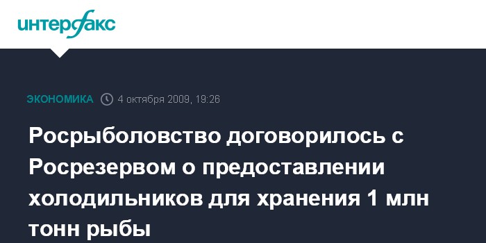"Росрыболовство провело переговоры с Росрезервом, результатом которых стала договоренность о том, что Росрезерв готов предоставить холодильные мощности на 1 млн тонн для хранения рыбы", - сообщил "Интерфаксу" руководитель центра общественных связей Росрыболовства Александр Савельев.