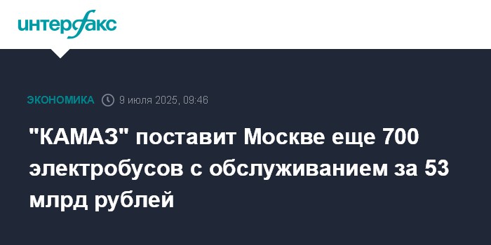 Москва. 9 июля. INTERFAX.RU - ПАО "КАМАЗ" получило очередной крупный контракт на поставку Москве электробусов с их 15-летним обслуживанием - компания предоставит еще 700 штук за 52,9 млрд рублей, говорится в материалах сайта госзакупок.