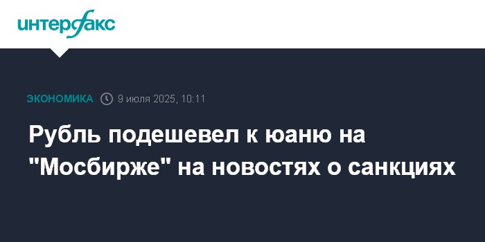 Москва. 9 июля. INTERFAX.RU - Утром в среду на "Московской бирже" рубль дешевеет к юаню в ожидании новостей на тему санкций.